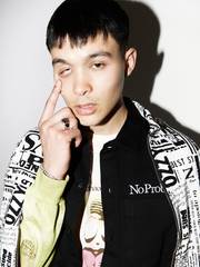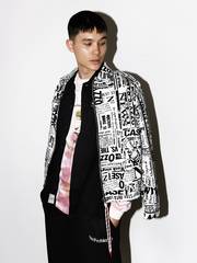 MODEL WEARS Aries Ozzy Jean Jacket, Aries Mini Problemo Uniform Shirt, Aries AAS Field Crew LS Tee, Maple Cuban Link Bracelet, Maple Duppy Signet, Aries Mini Problemo Sweatpant, Aries No Problemo Crew Sock, Vans Vault OG Authentic LX