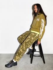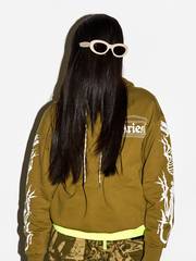 MODEL WEARS Sun Buddies Courtney Sunglasses, Aries Dragon Skeletor Hoodie, Aries Temple LS Tee, Aries Crinkle Camo Walking Trouser, Aries No Problemo Crew Sock, Salomon XT-4 OG