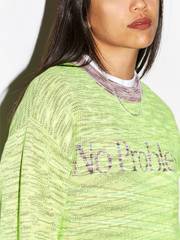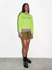 MODEL WEARS Aries Reverse Problemo Space Dye Knit, Aries Tuatura Cat SS Tee, Goods by Goodhood Curb Chain, Aries Press Gothic Elastic Skirt, Aries No Problemo Crew Sock, Toga Pulla Black Leather Mule
