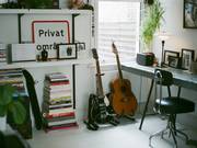 60s factory worker chair, old mechanics ramp turned into a desk, vintage 60s Yamaha acoustic guitar, Gretsch Electromatic guitar.