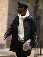 MODEL WEARS WTAPS T-6h 01 / Cap / Nylon. Tussah. League, Sub Sun x Goodhood GH004, Nanamica GORE-TEX Soutien Collar Coat, Beams Plus Sweat Pullover Hoodie Japan Made, Goods by Goodhood Curb Chain, Beams Plus Pocket SS Tee Nep Stripe, Nanamica ALPHADRY Wide Easy Pants, Adidas Samba OG