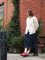 POPPY: I'm wearing the Puma Speedcats with a denim Beams Boy skirt, which I love. The length is perfect and it goes with everything. I've paired it with a striped shirt and a very chunky knit cardigan from AMOMENTO. It's finally cold enough in London to really layer and this knit is perfect for over shirts. AMOMENTO is one of my favourite brands at the minute and their winter pieces are always so good. I kind of regret not pairing it with the matching bonnet.