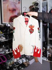 ST: The suits were both designed and made by our friend and super talented designer @DilaraFindikoglu. The pattern of my suit was based on my father’s original wedding suit from the ‘70s, which he had passed down to me. We kept some of the original elements like the wide lapels and flared pants but then reimagined it with a totally new attitude by transforming it in white and adding flames and embellishments. We referenced the suit Nudie Cohn made for Gram Parsons as well as Bobby Gilespe’s wedding suit by Alexander McQueen but added iconography that was more personal to us.