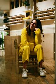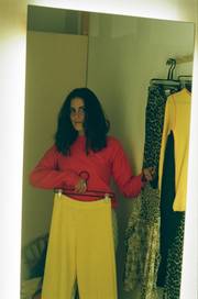 Trying on this yellow outfit in the store. it's the knitted one with the cuts that go up and they're like yellow knitted trousers - also the yellow knitted top. I'm going to buy it. I can't remember which brand it is (Baserange) but it's so nice. It's very sixties. I know it sounds a bit superficial because it's clothes, but clothes make me feel really happy. It's a creative thing I think.